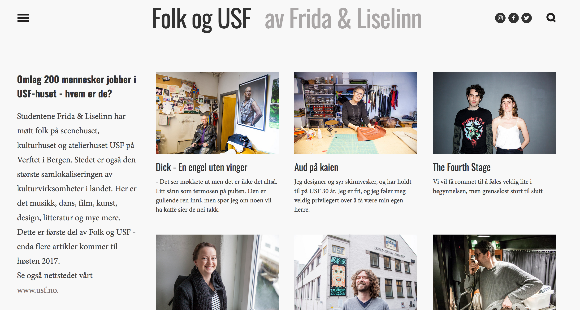 Studentene Frida Gjerstad Eide og Liselinn Woll Sigvaldsen laget folkogusf.no-prosjektet som en del av sin praksisperiode ved UiB Informasjonarbeid. I løpet av noen uker utforsket de hva dette stedet egentlig er og hva det byr på. De fant mange ulike mennesker både i kriker og kroker og på opplyste scener, de kjente på stemningen og spurte om hvilken betydning huset og stedet har for folk i kulturbyen Bergen.