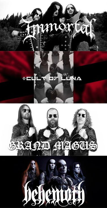 Trioen får følge av polske Behemoth og de to svenske bandene Cult of Luna og Grand Magus. Behemoth var sist i Bergen i 2008. Siden den tiden har vokalist Nergal kjempet seg gjennom livstruende kreftsykdom og gitt ut selvbiografi og vært mentor i den polske utgaven av The Voice. Cult of Luna gir deg suggererende post metal i gate med Isis og veteranene Neurosis, mens Grand Magus flagger heavy metal-tradisjonene som i sin tid gjorde Iron Maiden og Judas Priest til allemannseie. Oslobandet Tusmørke og Glasgowtrioen Holy Mountain spiller i Sardinen sammen med Grand Magus. Immortal, Cult of Luna og Behemoth spiller i Røkeriet.