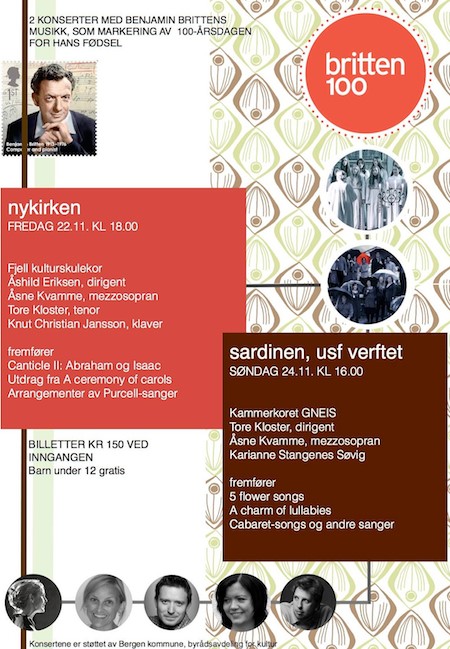Kammerkoret Gneis dirigert av Tore Kloster fremfører Five flower songs, og Åsne Kvamme, sang og Karianne Stangenes Søvig, klaver, fremfører et variert utvalg av Brittens sanger.
