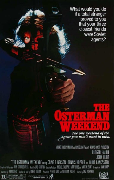 The Osterman Weekend. Regi: Sam Peckinpah. USA 1983. Manus: Alan Sharp og Ian Masters, etter en roman av Robert Ludlum. Foto: John Coquillon. Musikk: Lalo Schifrin. Medv.: Rutger Hauer, John Hurt, Meg Foster, Craig T. Nelson, Dennis Hopper, Burt Lancaster m.fl. Utleie: NB. Engelsk tale, norske undertekster. 35mm, farger, 1 t 42 min.