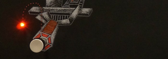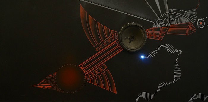 Hvoslefs særpregede non-figurative og fabulerende bildespråk kombineres med lyd og mekanikk i denne utstillingen med installasjon i stort format