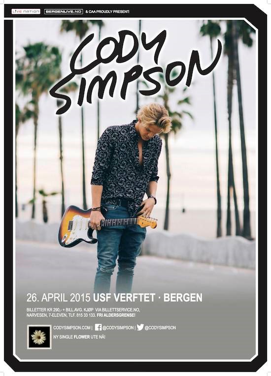Den australske popsensasjonen Cody Simpson kommer tilbake til Norge i april og gjør to konserter, i Bergen 26. april og i Stavanger 27. April. Da han spilte i Oslo i fjor sommer ble konserten på Sentrum Scene utsolgt i løpet av én time.