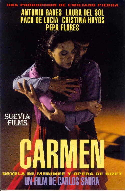 Carmen. Regi: Carlos Saura. Spania 1983. Manus: Carlos Saura og Antonio Gades. Foto: Teodoro Escamilla. Musikk: Paco de Lucía og Georges Bizet. Klipp: Pedro del Rey. Medv.: Antonio Gades, Laura Del Sol, Paco de Lucía, Cristina Hoyos, Juan Antonio Jiménez m.fl. Utleie: NB. Spansk tale, norske undertekster. 35mm, farger, 1 t 41 min.