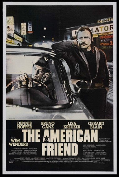Der Amerikanische Freund. Regi og manus: Wim Wenders, etter en roman av Patricia Highsmith. Vest-Tyskland 1977. Foto: Robby Müller. Musikk: Jürgen Knieper. Klipp: Peter Przygodda. Medv.: Bruno Ganz, Dennis Hopper, Gérard Blain, Liza Kreuzer, Nicholas Ray, Samuel Fuller m.fl. Utleie: egen kopi. Tysk tale, norske undertekster. 35mm, farger, 2 t 3 min.