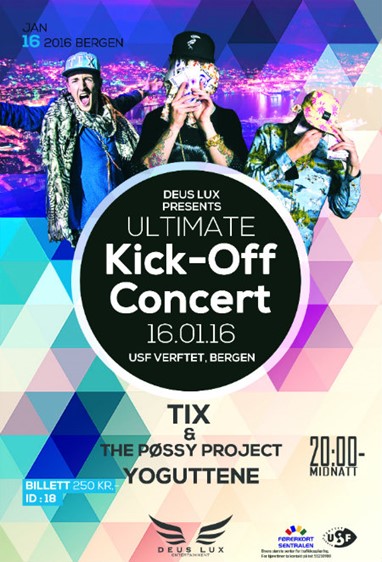 Deus Lux Entertainment starter året med tidenes Ultimate Kick-Off Konsert. Med variert line-up som vil garantert falle i smak for festglade folk. Det er ingen andre som kan gi oss en uforglemmelig kveld, enn Yoguttene, og Tix and the pøssy project. Samtidig gir vi mulighet for den unge talentfulle bergenseren, Andreas Øvretveit. Han er kanskje ung, men ikke undervurder hans egenskap bak Dj-bordet. Og til slutt Norwegian House Movement. Scenen er hans verden, og dansegulvet er hans kunst.