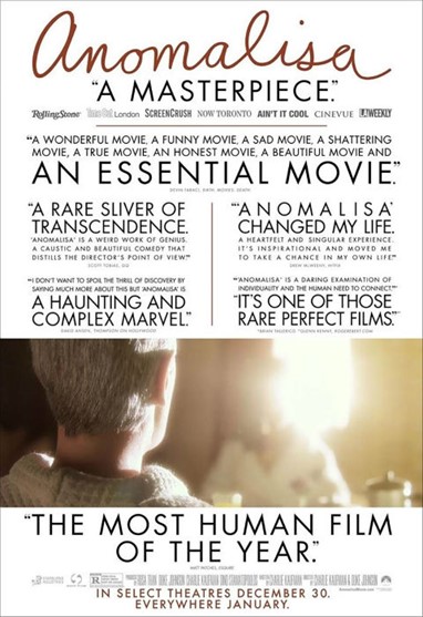 Charlie Kaufman burde være et kjent navn for filminteresserte. Hans manus til filmer som Evig solskinn i et plettfritt sinn (2004), Confessions of a Dangerous Mind (2002), Adaptation (2002) og Being John Malkovich (1999) har etablert ham som en av vår tids mest kreative og uforutsigbare hoder i Hollywood. Charlie Kaufman gir assosiasjoner til begreper som kvalitet, humor og originalitet. Ved siden av selv å ha regien – som han også hadde i Synecdoche, New York (2008) – har han denne gangen begått en dukkefilm. Anomalisa er et introvert kammerspill av en animasjonsfilm, hvor hovedpersonens livskrise og intense selvopptatthet manifesterer seg i hvordan verden fortoner seg for ham. Et blikk som vi publikum deler, og som slett ikke gjør filmens første halvdel lett å trenge inn i. Men Kaufmans brilliante ideer avslører seg selv etter hvert som filmen skrider frem, og tvinger oss umerkelig til å ta stilling til en rekke filosofiske og etiske problemstillinger.