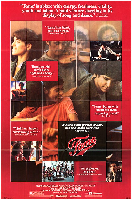 Fame. Regi: Alan Parker. USA 1980. Manus: Christopher Gore. Foto: Michael Seresin. Musikk: Michael Gore. Klipp: Gerry Hambling. Medv.: Irene Cara, Eddie Barth, Lee Curreri, Laura Dean, Paul McCrane, Barry Miller, Gene Anthony Ray m.fl. Utleie: NB. Engelsk tale, norske undertekster. 35mm, farger, 2 t 13 min.