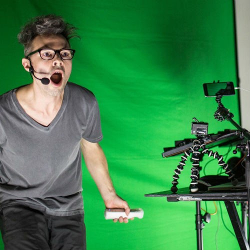 Bak kontrollbordet redigerer han sitt eget skjermliv live. Vi ser ham der på scenen, og vi ser ham på film, i sosiale medier, i videospill, på digitale skjermer i skjermen, i selfier, på Instagram, på plakater, i reklamer, på date-apps... Hvor vi i virkeligheten er og hva vi ser, blir snart et stort spørsmål. Hvor foregår egentlig denne forestillingen?