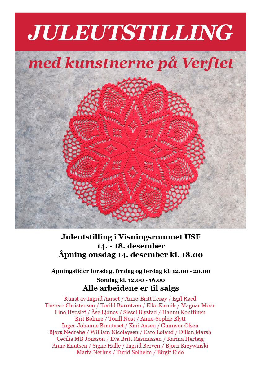 Mange av kunstnerne som har atelierer i USF-huset på Verftet har slått seg sammen og lager juleutstilling. Alle arbeidene som vises er til salgs, og her er det virkelig sjans for finne en julegave som gleder noen (eller deg selv).