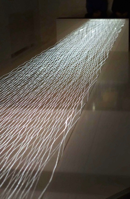 I utstillingen SPRANG møter vi en komposisjon av lyd som omformes til lys og aktiverer et flettverk av optiske fiber. Installasjonen tar i bruk vindusruten mot sjøen som klangflate og gjør at deler av lyden også kan høres fra plassen utenfor Visningsrommet.