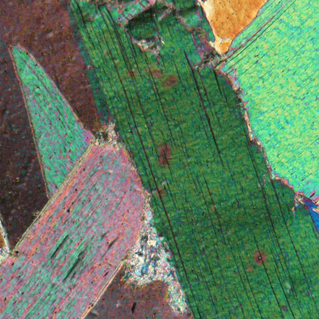 I utstillingen møter vi steinens mikrostruktur og mineralske sammensetning, en studie av farge, persepsjon og optisk forgrening mellom seeren, objektet og rommet.