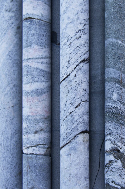 Prospecting: A Geological Survey of Greys is an interdisciplinary art project that appropriates the scientific geological methods of extracting, analysing and categorising mineral specimens. Jonsson has worked with mineral prospecting, where she has taken out cylindrical rock-core samples out of the 2.5-billion-year-old primary rock in Sør-Varanger municipality outside Kirkenes, in search of the bedrocks shades of grey tones.